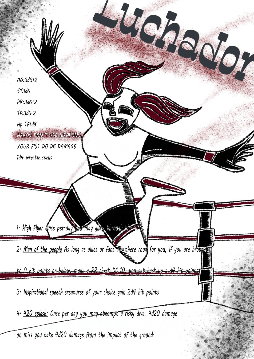 LUCHABORG is a rpg zine about luchadores and masked wrestlers fighting a fascist government. Made with MorkBorg's open game license. Contains 3 classes based on wrestling archetypes and a table for a gauntlet of fights with stipulations.